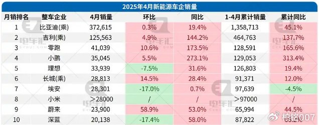 然而传统汽车企业进攻新能源汽车市场实在太猛了,以电车二哥为例,2024年它的新能源汽车销量为88.8万辆,而电车一哥的销量为400多万辆,只是后者的五分之一多一点;今年4月份它的电车销量已达到12万多辆,电车一哥的销量为38万辆,二哥的电车销量已相当于一哥的三分之一了。