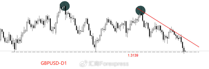 技术角度看,日线级别,GBPUSD处于筑顶后的回调阶段。图中两个深色圆形代表双顶结构,前后高点形成时间分别为7月份和9月份,数值分别为1.3787和1.3725点,时间差距显著且数值接近,双顶结构较为稳固。9月份以来的下跌波段走势流畅,尤其是过去三个交易日,连续收出长阴线,空头动能强烈。昨日K线跌破4月15日以来的最低点,面临关键支撑位的考验。考虑到空头动能强烈,1.3139支撑位被有效跌破的概率较高。