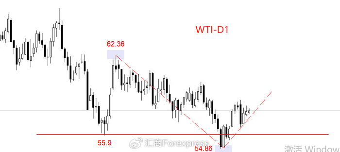 行情方面,日线级别,美原油WTI处于重心不断下移的横盘震荡状态。震荡状态在今年4月份就已经开始,底部支撑区域在55美元附近。中期高点为图中62.36美元,中期低点为图中54.86美元,最新的上涨波段正在形成新的中期高点。经过半年多的重心下移后,美原油报价已经非常接近底部区域。最新市价57.9美元,底部区域55美元。如果最新上涨波动不能突破62.36的中期高点,未来有可能再次启动下跌走势,并严重威胁55美元的支撑作用。