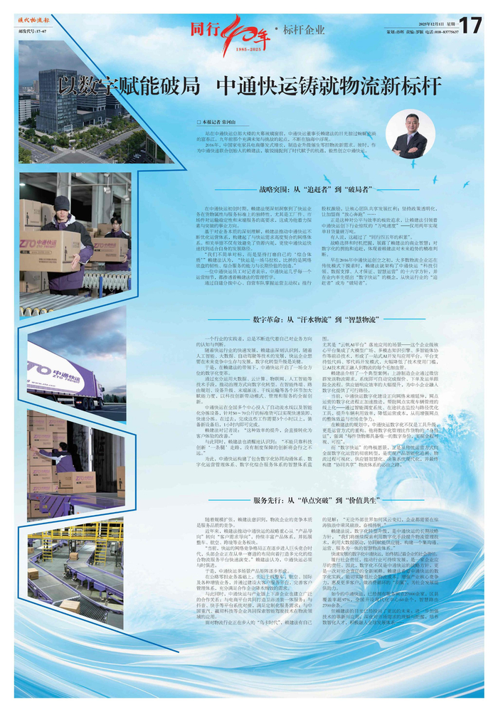 早在2016年中通快运创立之初,大多数物流企业还在传统模式下摸索时,赖建法就架构了中通快运“科技引领、数据支撑、人才保证、智慧运营”的十六字方针,并在业内率先提出“数字快运”的概念,从快运行业的“追赶者”成为“破局者”。