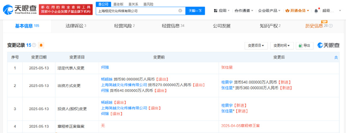 天眼查App显示,近日,上海栩泥文化传媒有限公司发生工商变更,杨超越及名下上海简越文化传播有限公司、何强退出股东行列,新增桂震宇、张佳星共同持股,同时该公司法定代表人和主要人员也发生变更。