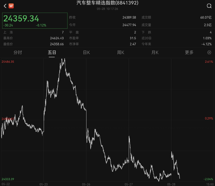 A股方面,比亚迪(002594.SZ、1211.HK)盘中一度跌超6%,截至5月26日收盘下跌5.93%,报381元/股。而在前一交易日涨停的赛力斯(601127.SH)也出现大跌,午后一度跌超5%,截至收盘下跌4.23%,报139.7元/股。此外,众泰汽车(000980.SZ)跌超3%、海马汽车(000572.SZ)、长城汽车(601633.SH、2333.HK)、长安汽车(000625.SZ)、北汽蓝谷(600733.SH)、上汽集团(600104.SH)等均跌超2%。据同花顺数据显示,当日A股汽车板块收跌1.78%,单日市值蒸发约1000亿元。