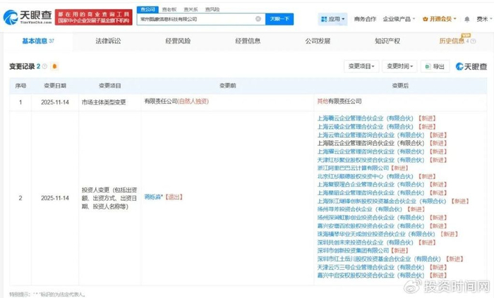 天眼查工商信息显示,近日,常州甄象信息科技有限公司发生工商变更,蒋烁淼退出该公司股东,新增浙江阿里巴巴云计算有限公司、上海羲云企业管理合伙企业(有限合伙)、上海云绾企业管理咨询合伙企业(有限合伙)等为股东。