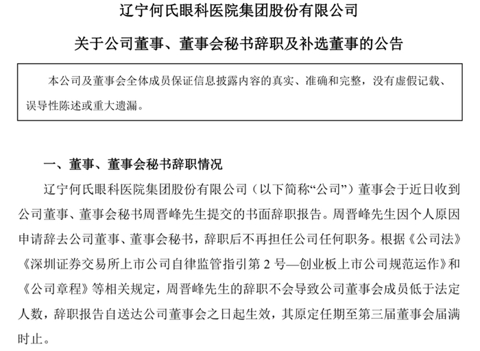 何氏眼科发布董事、董秘辞职相关公告