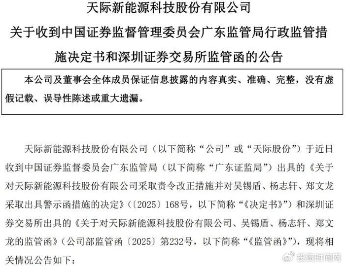 鉴于上述违规行为,广东证监局决定对天际股份采取责令改正的行政监管措施,同时对公司董事长兼总经理吴锡盾、财务总监杨志轩、董事会秘书郑文龙采取出具警示函的行政监管措施;深交所也提醒公司及全体董事、高级管理人员严格遵守法律法规,真实、准确、完整、及时、公平地履行信息披露义务,杜绝此类事件发生。