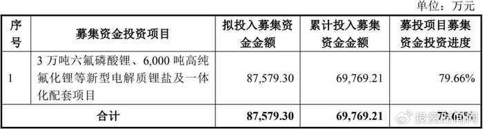 时至2025年12月,天际股份又发布募投项目延期公告,截至2025年11月30日,公司“3万吨六氟磷酸锂、6000吨高纯氟化锂等新型电解质锂盐及一体化配套项目”已累计投入6.98亿元募集资金,尚未使用的募集资金为1.86亿元(含利息、现金管理收益扣除银行手续费净额),募投项目募集资金投资进度为79.66%。基于客户需求、市场环境和发展规划审慎评估,公司决定将该募投项目达到预定可使用状态日期从2025年12月延期至2026年12月。