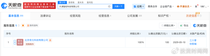 天眼查App显示,天津智炬科技有限公司成立于2024年5月,法定代表人为梁志辉,注册资本100万人民币,经营范围包括计算机系统服务、工业互联网数据服务、数据处理和存储支持服务等。股东信息显示,该公司由北京奇元科技有限公司全资持股。值得注意的是,周鸿祎为该公司实际控制人。