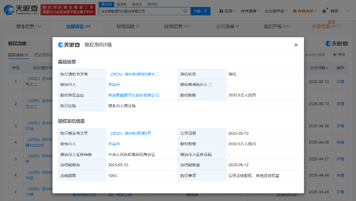 天眼查App显示,近日,合众新能源汽车股份有限公司新增股权冻结信息,被执行人为哪吒汽车创始人方运舟,冻结股权数额2000万人民币,冻结期限自2025年5月13日至2028年5月12日,执行法院为浙江省嘉兴市桐乡市人民法院。