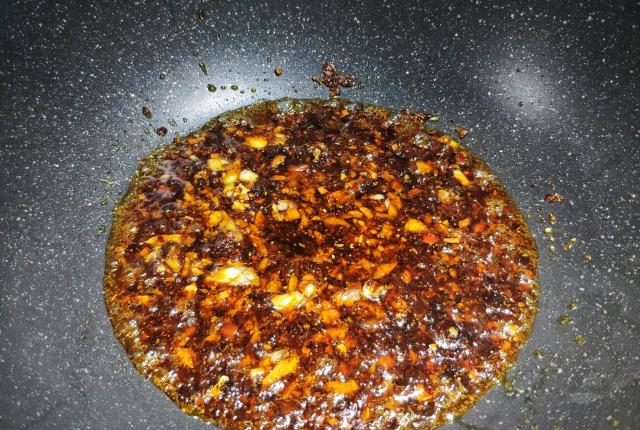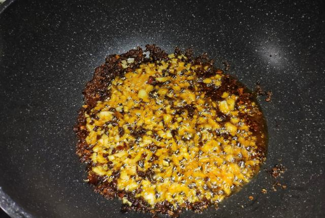 木瓜丝准备好了,开始制作酱汁。玉米油小火爆香蒜蓉和麻辣干锅料,红油出来后倒入特鲜酱油稍微煮热一下就可以。木瓜丝的做法有不少,但是放麻辣香锅料的还真是没见过,我尝过一次后就认定了这个做法,实在太香了。