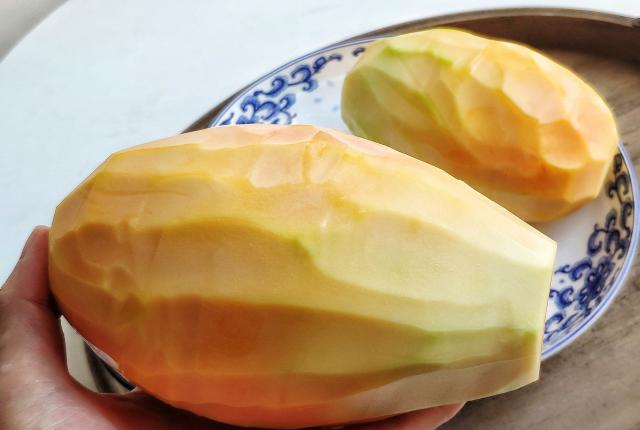选用青木瓜,不管这木瓜是哪个品种,只要摸起来硬邦邦的就可以。我这个是水果木瓜的品种,外皮看起来青色,虽然摸起来很硬,其实瓜肉的颜色接近胡萝卜,此时吃起来的口感也跟胡萝卜的差不多,是生脆清甜的味道。平时外面售卖的香辣木瓜丝是用特别生的青木瓜制作而成,肉色白且有点涩味,通过加冰糖来调和涩味。根据多次制作的经验来看,我觉得不一定得选用特别生的青木瓜来制作木瓜丝,只要摸起来硬邦邦的木瓜也可以,尤其是瓜肉变成胡萝卜色仍能保持硬爽的木瓜,虽然爽脆度稍微逊色一点,但没有涩味,入口清甜又有嚼劲,这点是特别生的青木瓜比不上的。