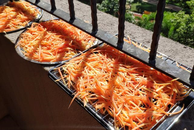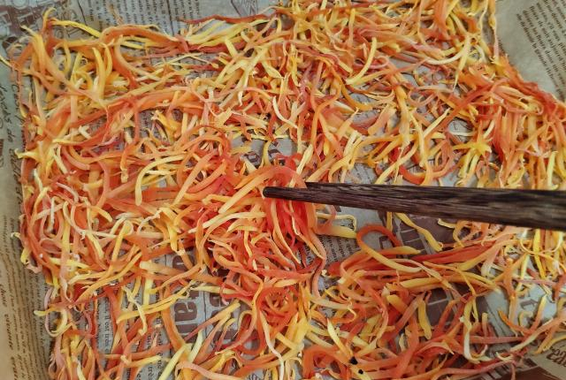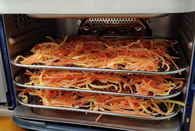 接下来就是晾晒或者烘干的步骤,我总结了三种实用的方法,可行性十分高,大家可以根据具体情况去选择。①利用太阳晒干。这是最传统的晾晒方法。将木瓜丝放在太阳底下晒到半干,大半天时间就晒好了,环保省电。但是现在好些人因为居住在城市的缘故,没有条件在阳光底下晒东西,而且室外灰尘较多,这样晒干的木瓜丝必须清洗过才能食用。如果制作过程中处理不当,这些接触过水的的木瓜丝就容易坏掉,存放时间不长,尽可能在几天内吃完。