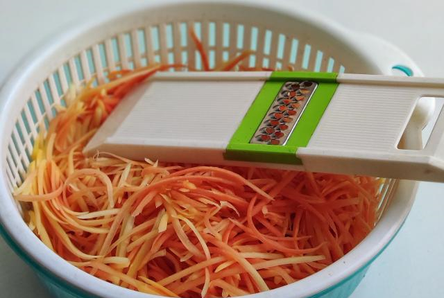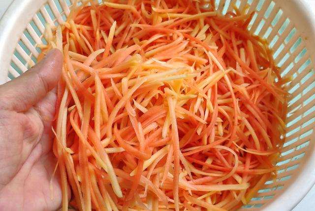 木瓜去皮去瓤,用刨丝器刨成细丝,这样的粗细正好。木瓜丝一般需要经过几个小时或者一整晚腌制才能入味,我特意将木瓜丝刨细一些,晾干后用调料一拌就能立即入味,而且这样的口感很好,既能拿来当零食,也可以佐粥下饭。