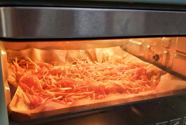②用烤箱烘干。现在不少家庭都有烤箱,用烤箱烘干是最快速省时的方法。烤盘上铺油纸,均匀放入木瓜丝。烤箱预热上下火100度,将烤盘放置中层,烘烤2小时就可以。当烘烤时间过半时,取出木瓜丝,用筷子翻动一下,以便烘烤均匀。