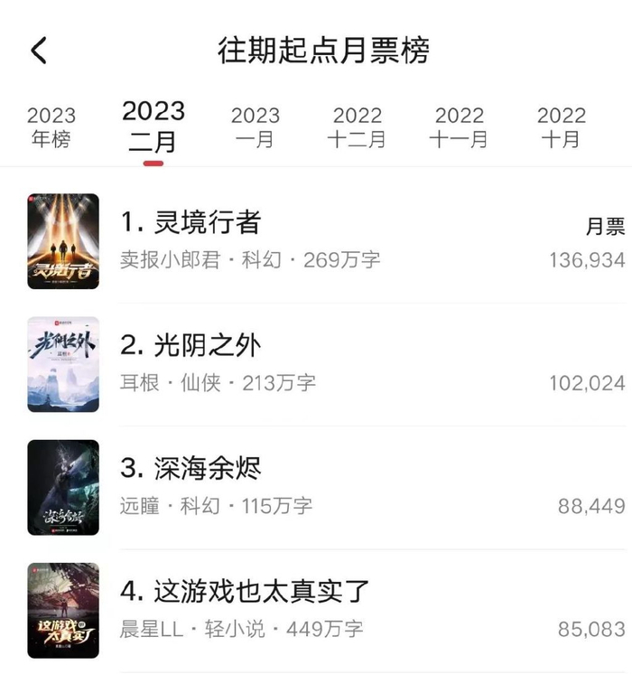 过去的一年,起点月票榜也见证了科幻的火热。在起点读书2022年度月票榜TOP10中,半数作品具有科幻元素。至今年2月,《灵境行者》《深海余烬》两部科幻作品,依然位列月票榜第一、第三位,同时读者还给出了单月13.6万和8.8万的月票成绩。