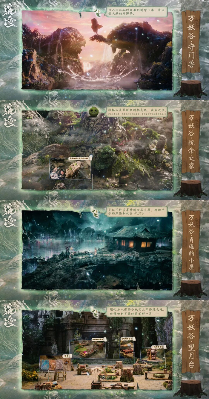 万妖谷口威猛的守门兽有石狮子的影子,肖瑶住的小屋窗子是蜻蜓翅膀的形态,初化人形的小妖们齐聚望月台上课,课桌文具都依据不同的妖怪属性各具风格……这是一个以万物有灵、自然神迹为底色,从真实场景里提取奇幻感,融合中式美学与山河地貌打造出的童话奇境。