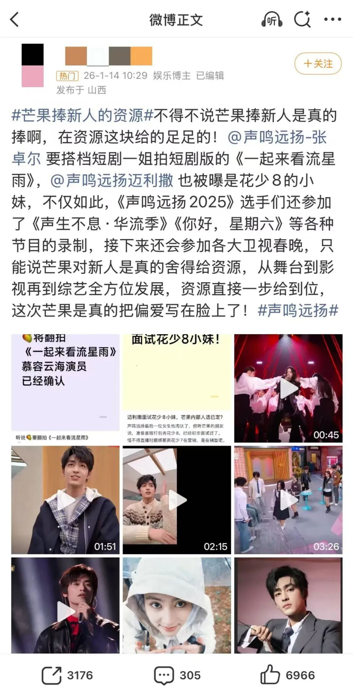 当许多音综还停留在“选一个冠军”的逻辑里时,《声鸣远扬2025》的视野明显更长。#芒果捧新人的资源##芒果捧新人的资源##网传歌手2026首发已确定#等高位热搜话题,更是说明《声鸣远扬2025》所押注的,并非短期回报,而是新人在更长时间尺度中的未来可能性。