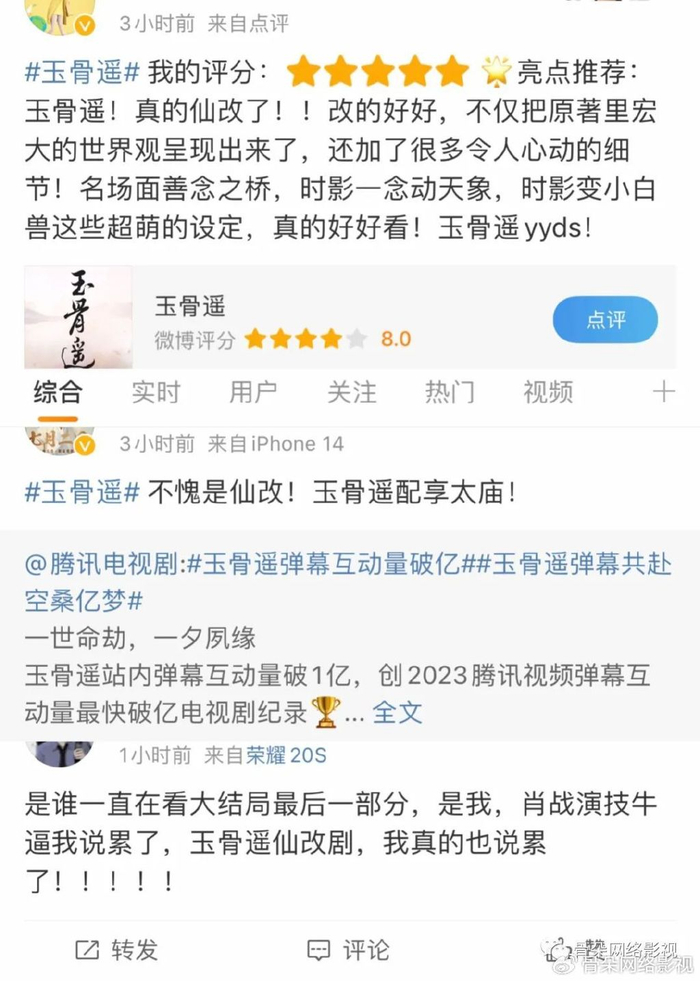 这个令人遐想的结局引发观众热议:时影是真的复活了,亦或只是朱颜的幻想?他是否只能借助雪寒薇才可现出身形?时影登临真境后是否成了神?等等。事实上,高涨的讨论热情自《玉骨遥》开播起就一直没有消退过。开播以来,玉骨遥连续两周登顶骨朵剧集热度指数周榜,腾讯视频站内,《玉骨遥》创下首个发帖量破800万剧集、2023弹幕互动量最快破亿等多个纪录,在腾讯视频海外版WeTV上的数据亦十分亮眼,在包括美国、加拿大等在内的多个国家和地区获得了单日播放量的冠军。口碑方面也一路攀升,剧情立意、制作水准、演员表演等诸多方面都得到了广泛认可,尤为难得的是,《玉骨遥》的改编也是大受赞誉。