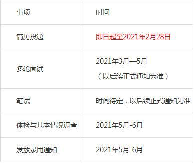 招聘安排:报名——多轮面试——笔试——体检与基本情况调查——发放录用通知