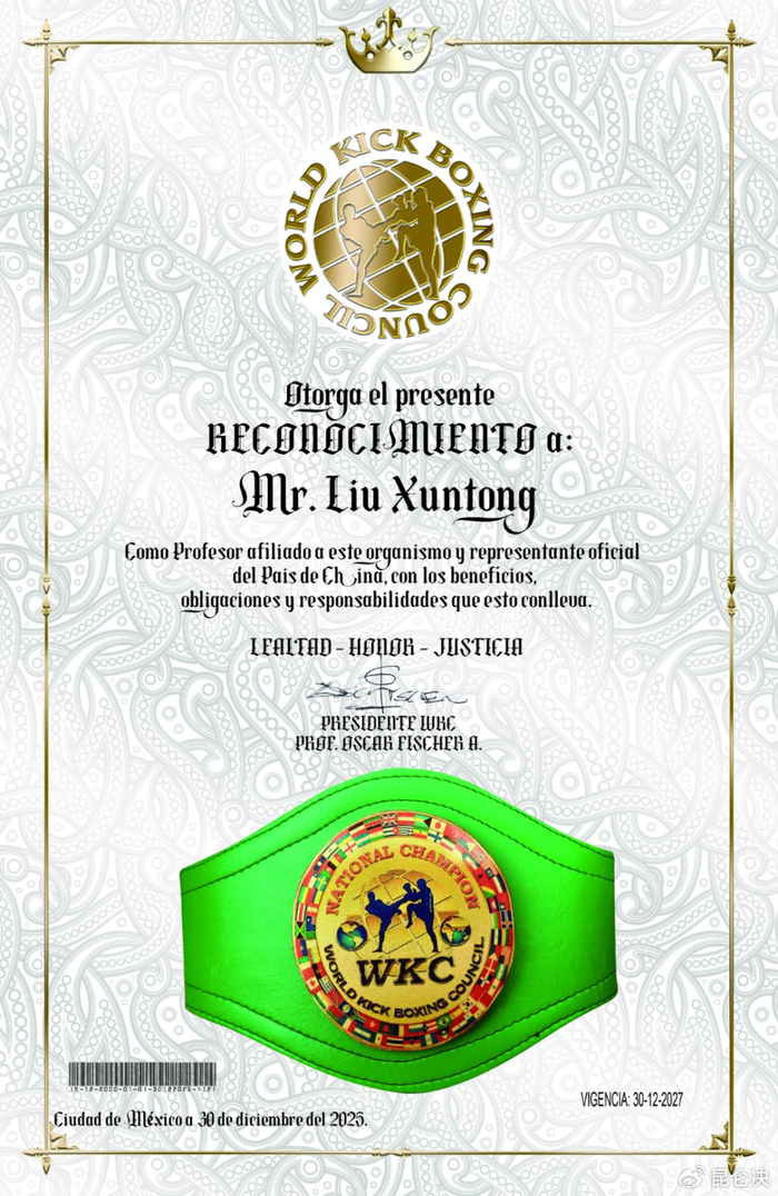 经世界自由搏击理事会(WKC)主席奥斯卡·菲舍尔·阿尔马拉兹(Prof. Oscar Fischer Almaraz)先生邀请,获昆仑决创始人姜华先生(Mr. Jiang Hua)批准,WKC中国区委员会正式成立。姜华先生担任世界自由搏击理事会(WKC)全球首席战略顾问,并委任昆仑决总教练刘训通(Liu Xuntong)担任WKC中国区主席,主持开展全面工作。