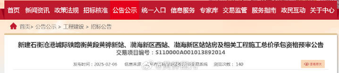 2月6日,京津冀城际铁路投资有限公司在铁路工程管理平台上发布新建石衡沧港城际铁路衡黄段黄骅新站、渤海新区西站、渤海新区站站房及相关工程施工总价承包资格预审公告。