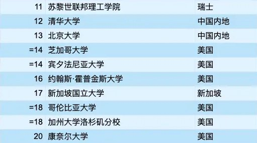 清华大学继续排在Top12,紧紧咬住前方的苏黎世联邦理工学院(ETH Zurich);