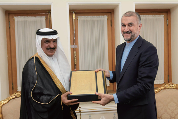 2023年,在中国斡旋下沙特和伊朗宣布恢复外交关系。图为2023年9月10日,沙特驻伊朗大使阿卜杜拉·安齐向伊朗外长阿卜杜拉希扬递交国书副本。(Iranian Foreign Ministry / Handout/澎湃影像/IC photo图片)