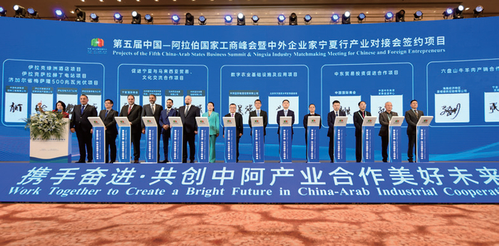 2023年9月21—24日,第六届中国—阿拉伯国家博览会在宁夏银川召开。图为9月21日,第六届中阿博览会期间举行的第五届中国—阿拉伯国家工商峰会暨中外企业家宁夏行产业对接会签约仪式。(新华社图片)