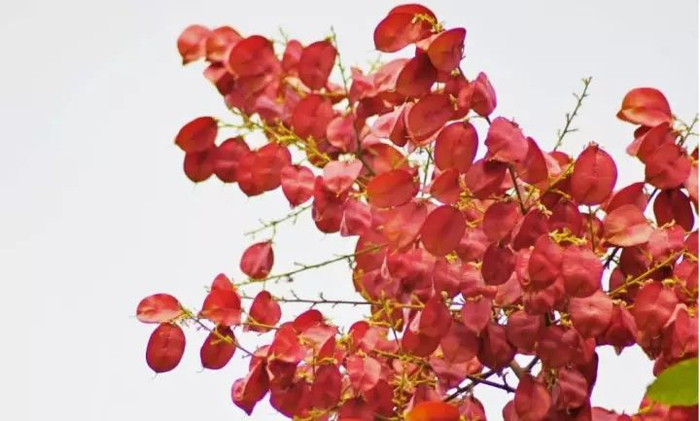 酷似串串灯笼的红色蒴果与鲜黄色秋叶交相辉映