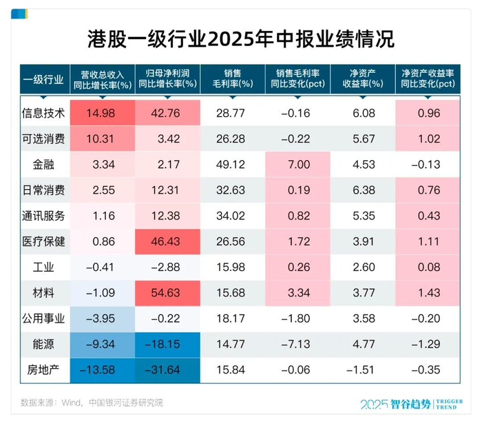 Wind数据显示,2025上半年1454家港股企业实现利润增长,从一级行业来看,信息技术、可选消费的营收增速超10%;信息技术、医疗保健、材料净利润增速超40%,显著领先于其他行业,成为拉动港股盈利增长的核心引擎。
