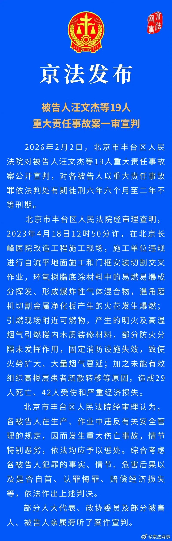 2026年2月2日,北京市丰台区人民法院对被告人汪文杰等19人重大责任事故案公开宣判,对各被告人以重大责任事故罪依法判处有期徒刑六年六个月至二年不等刑期。