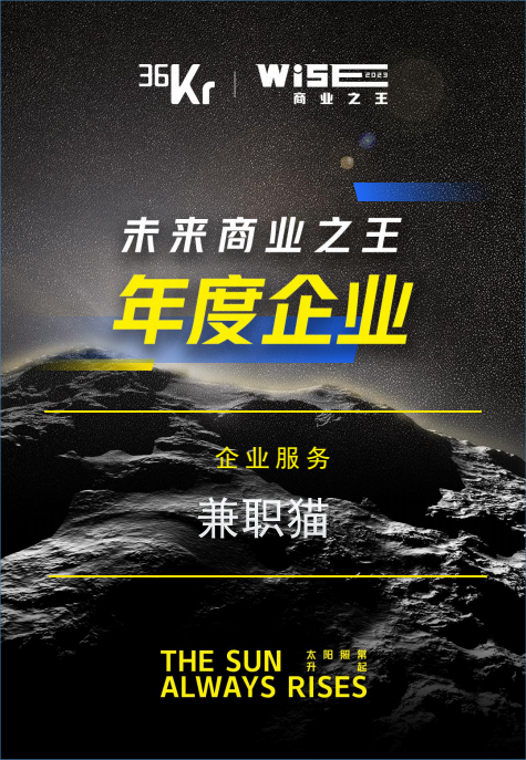 作为国内领先的推动数字化升级的人力资源服务平台,兼职猫凭借行业领先的技术创新能力、产品服务能力、及成熟的商业落地经验,荣获36氪“WISE2023未来商业之王年度企业”称号,彰显企业服务赛道人力资源领域“数智实力”。