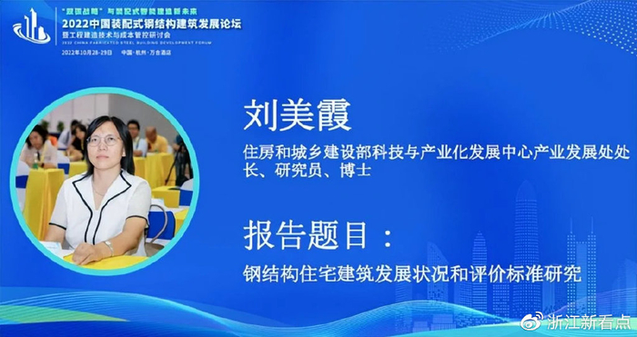 住房和城乡建设部科技与产业化发展中心产业发展处处长、研究员,刘美霞博士为在场观众分享了主题为《钢结构住宅建筑发展状况和评价标准研究》的报告。