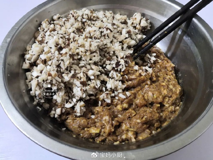 4,再把香菇洗净,剁碎后入盆,搅匀,这个鸡肉香菇馅就调好了