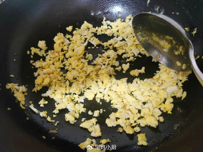 3,炒锅里加少许植物油,直接磕入鸡蛋,搅炒成鸡蛋碎,离火凉透