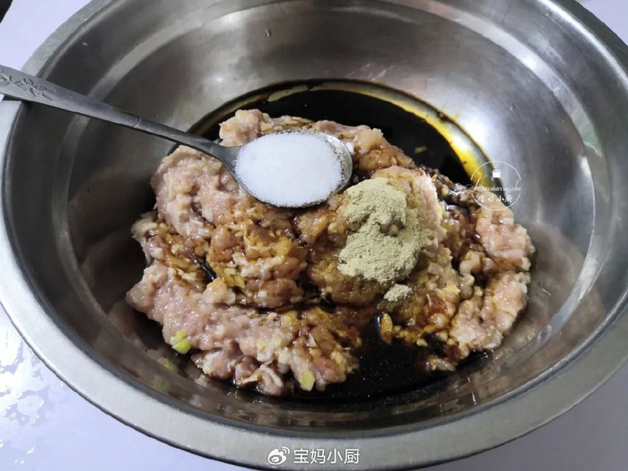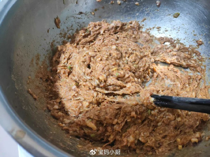 2,把肉馅入盆,加入葱姜末、料酒、酱油、盐、十三香、植物油、香油,搅到细腻起黏