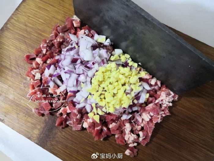 2,把饺子面团和好,盖上盖子饧面2小时,中途再揉面2次,饺子皮更筋道。然后把牛肉切碎,再切一些洋葱碎和姜末,一起剁碎至细腻