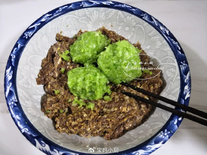 3,把剁好的肉馅入盆,分次搅入一些清水至滋润,再加入酱油、十三香、料酒、植物油、盐,用筷子顺着一个方向搅到细腻起黏。再把提前切末并刹过水的芹菜稍微攥水,入盆,搅匀,这个牛肉芹菜馅就调好了
