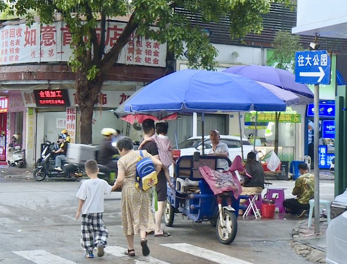文祠路是连接澄海新老城区的交通要道,上下班高峰时期车流量和人流量都很大。上午8点15分,正值学生上学和上班高峰期,记者在文祠路和环城西路、益民路和环城西路的交界处看到,用三轮车载货摆卖的流动摊贩正占据着机动车道经营,这些流动摊贩售卖的商品多为蔬菜和水果,吸引了不少市民前来购买,使道路变得拥堵。行人和非机动车被迫在狭窄的剩余空间中穿梭,与机动车混行,险象环生。机动车则因道路变窄,行驶缓慢,常常排起长队,造成严重拥堵。下午5点半,在文祠路与会堂街的交界处,商贩将商品随意摆放在道路上,行人在车辆跟摊位间艰难穿行,存在交通安全隐患。