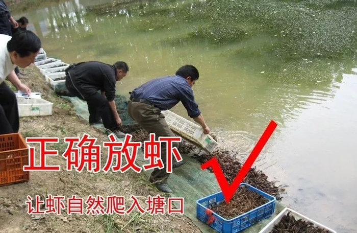 放养前处理,取三个大盆,分别放(泡腾维生素C)500倍稀释液、虾塘水、(浓碘)1000倍稀释液,把虾筐浸入(泡腾维生素C)稀释液30秒,取出沥干后;再置入虾塘水中30秒,取出沥干;最后再把虾筐浸入(浓碘)稀释液中30秒。然后轻轻把虾筐的一大半没入水中,三分之一露在水面,待龙虾自行入水栖息躲避,不可直接倒入水中,活力差或不爬走入水的虾要清理走。