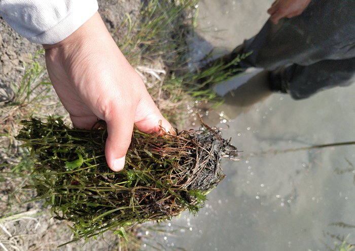 3、勤检查水草的草根,如发现水草草根发黄,水草长势不佳的塘口,在有水草的局部区域,使用水田虾的“水草控长素”,恢复水草的活性,促进其生根萌发生长。