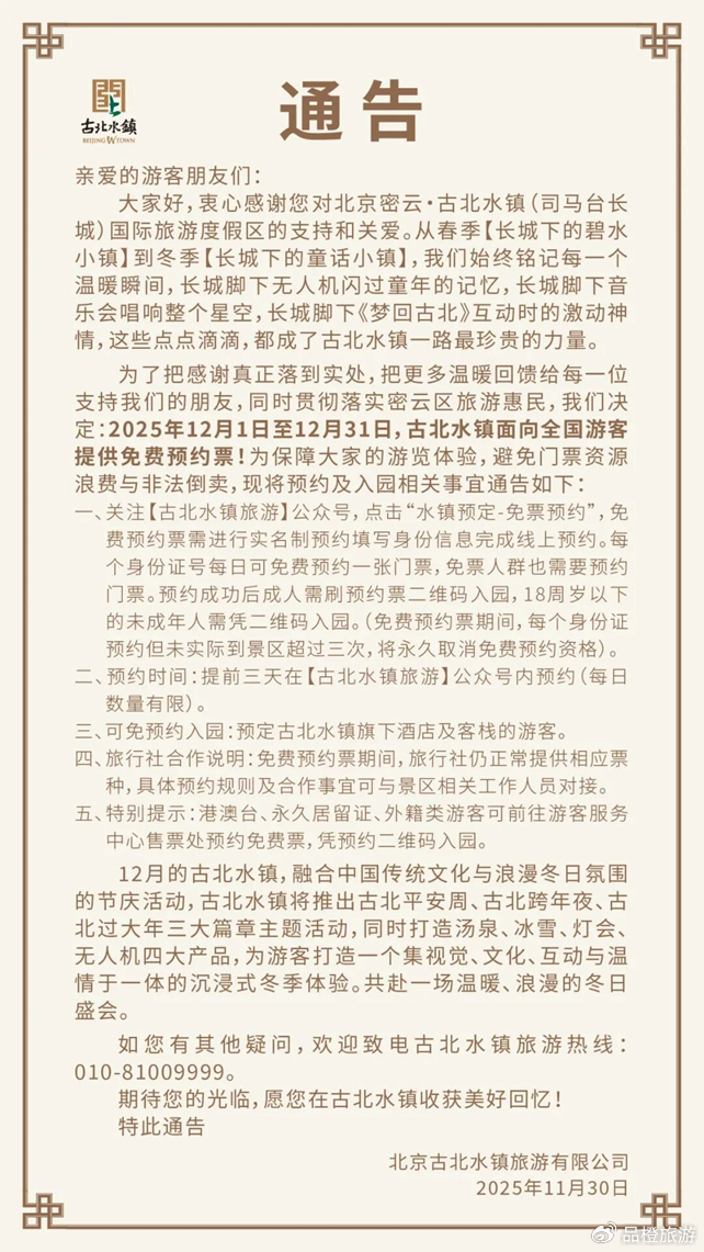 【品橙旅游】北京密云·古北水镇(司马台长城)国际旅游度假区(以下简称“古北水镇”)于11月30日发布了一项暖心举措:2025年12月1日至12月31日,面向全国游客实行景区门票免费入园政策。