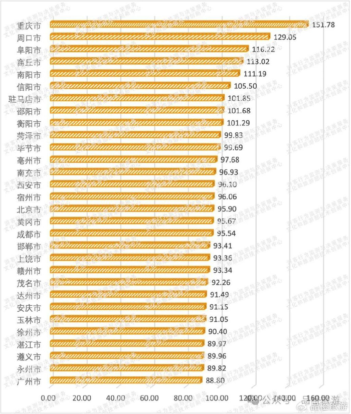 春节假期期间,跨市深度游游客量(来自其他城市且在该城市停留6小时以上的游客人数,本部分以下简称“外地深度游客”)前30的城市共接待外地深度游客3562.6万人,平均每个城市接待外地深度游客1187.5万人。Top3热门的城市分别是重庆、周口和阜阳。