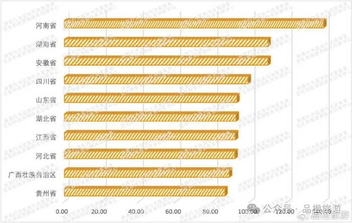 省域深度游游客量(省内各城市外地深度游客量加总去重,不考虑直辖市)前10的省区共接待54036.7万人,平均每个省级目的地接待深度游客5403.7万人。河南省、湖南省和安徽省位列省域深度游客量前三位。