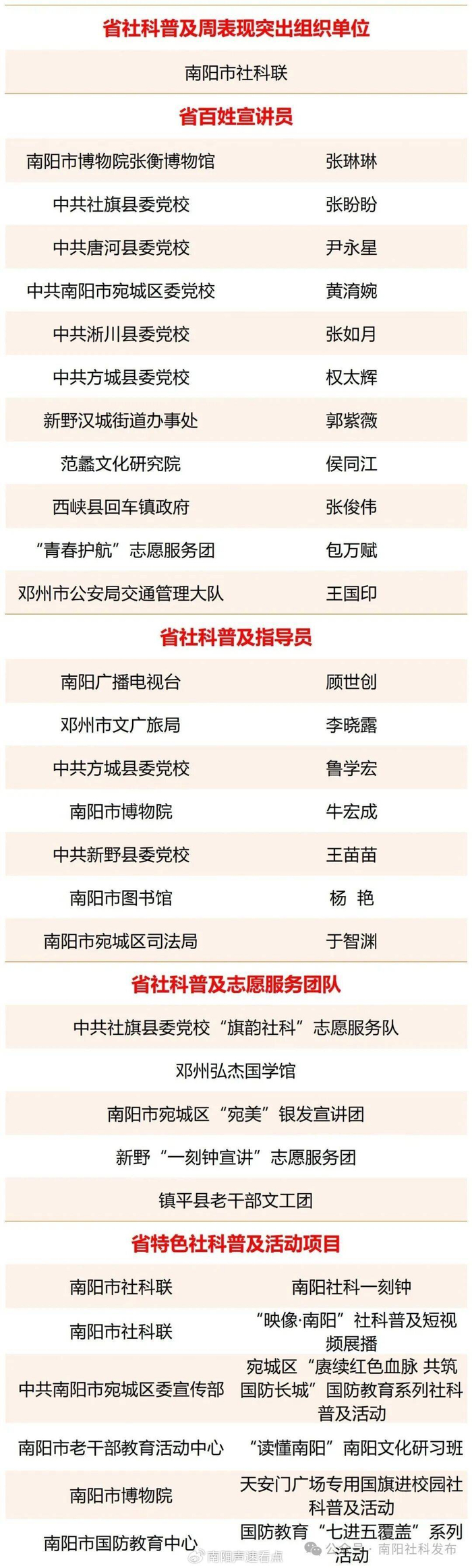 南阳市博物院党总支书记、院长牛宏成荣获“河南省社科普及指导员”,张琳琳荣获“河南省百姓宣讲员”,“天安门专用国旗进校园社科普及活动”荣获“河南省特色社科普及活动项目”。