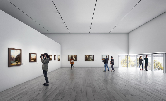 △(一期)克罗亚洲艺术博物馆 –广场及入口效果图 ©Morphosis艺术文化区一期计划建设的克罗亚洲艺术博物馆新馆专注于展示亚洲艺术,将包含1,500平方米的灵活展示空间。其各端的大尺度开窗可提供充足的自然采光。同时,巧妙的遮光设施也可保护对光敏感的藏品。馆内将包含先进的艺术品修复实验室、艺术品储藏室、研讨室,行政办公区,以及以项目发起人里克·布雷特尔命名的图书馆,用以收纳布雷特尔先生的个人图书收藏。