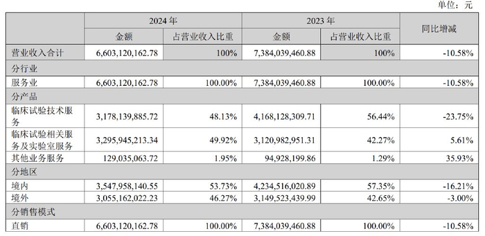 2024年,泰格医药两项核心业务的占比发生变化,临床试验技术为48.13%,下降超过10个百分点,毛利率也下降到了29.56%;临床试验相关服务占比提升到49.92%。