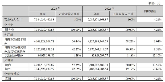 从历史财报看,泰格医药的核心服务分为临床试验技术和临床试验相关服务,两项业务2022年的营收占比分别为58.22%和40.59%,其中临床试验技术2023年的毛利率为38.21%。