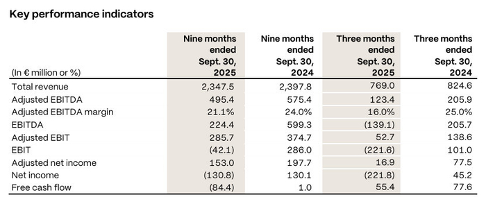 其中,第三季度实现营业收入7.69亿欧元,同比减少6.74%;实现经调整EBITDA 1.23亿欧元,同比减少40%;实现净亏损2.22亿欧元,与去年同期相比同样是由盈转亏。