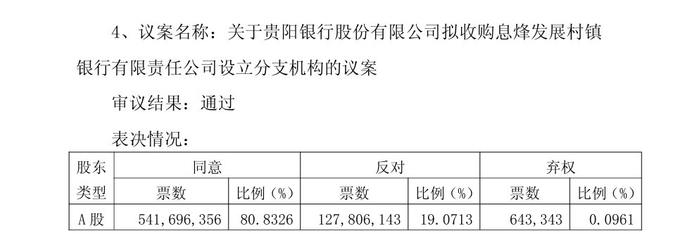11 月 26 日,贵阳银行股份有限公司(以下简称 “贵阳银行”)召开 2025 年第三次临时股东大会,核心审议《关于拟收购息烽发展村镇银行有限责任公司设立分支机构的议案》。该议案最终以多数票获通过,但却遭到19.0713%股东反对,特别是5%以下股东反对票的比例高达27.2325%。