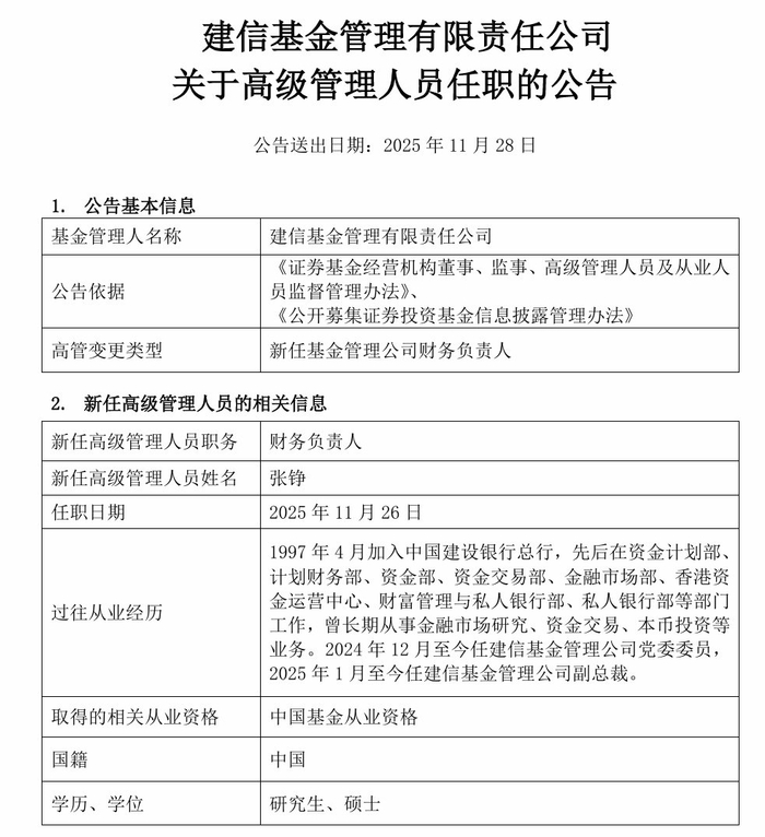 11月28日,建信基金管理有限责任公司发布公告称,经董事会审议通过,聘任张铮担任财务负责人,任职时间自2025年11月26日起生效,相关事项将按规定报中国证监会北京监管局、中国证券投资基金业协会备案。